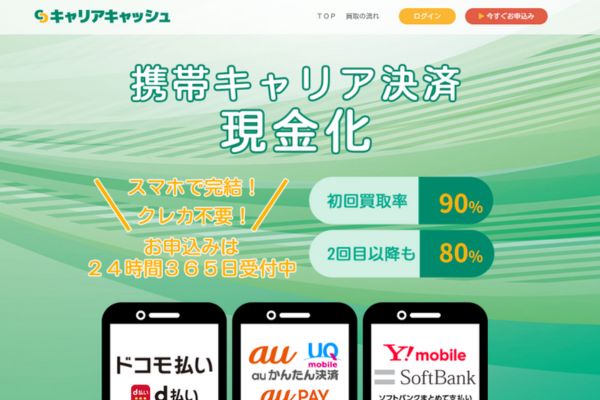 キャリアキャッシュは、換金率は最大90%・最短5分振込をうたう現金化業者です。